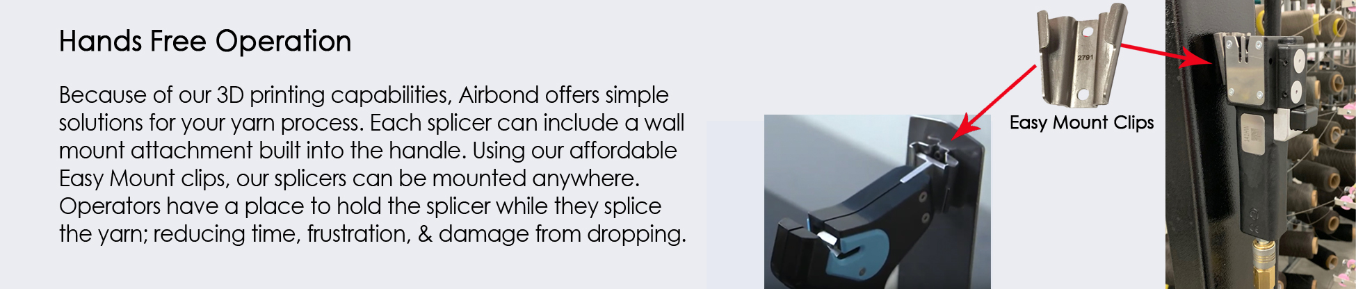 The 701 represented a leap forward in design, out-performing all others in one simple, elegant package. Strengths of 90 per cent of the parent yarns are easily attainable. And, like other splicers in the Airbond range, the 701 is reliable and simple to maintain.Don't take our word for it, try it out yourself! We offer a 30 day free trial on our splicers. Contact us to determine your needs and we'll be happy to work with you for the perfect solution.