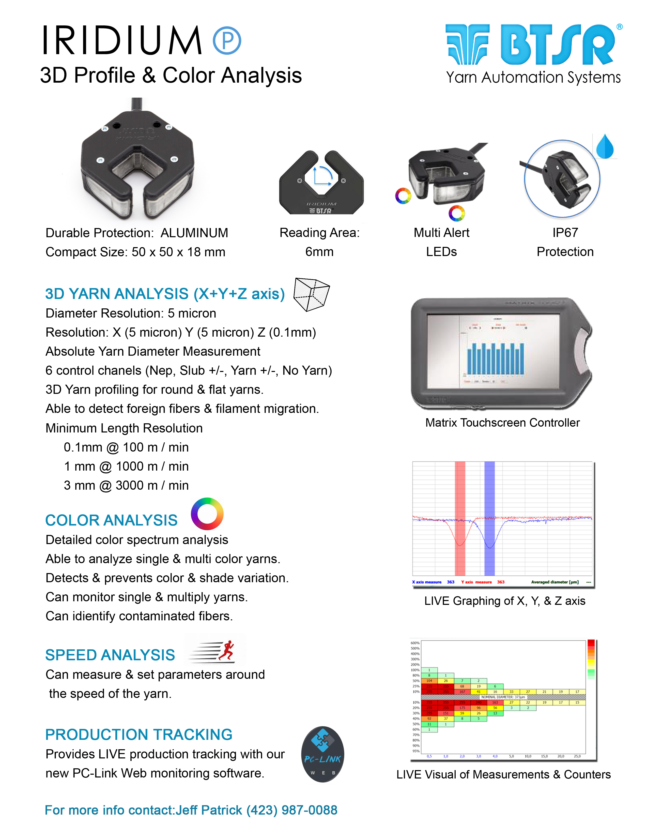 1. 3D PROFILE ANALYSIS - The sensor provides incredible resolution down to 5 microns (half a filament). The 3D profiler works with round or flat yarns, and is able to detect foreing fibers, as well as filament migration. Iridium works on all types of yarns and fibers and can detect any defect in the fiber. It is perfect for extrusion and other processes that require exact precision with fiber quality.