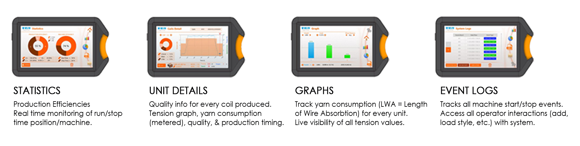PRODUCTION TRACKING - As with all our sensors, the TOUCH MATRIX provides LIVE production tracking which can connect to our Network software, giving you automation at multiple levels. This cloud based system monitors & tracks all yarn stops, breaks, & doffs for showing production/waste in real time. It can also connect to any PC or smartphone to give you instant visibility of your production from anywhere in the world.