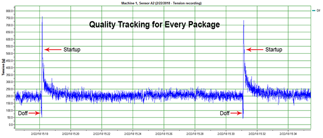 Besides tracking quality, every tension sensor is programmed to track production and can perform as a stop motion device. All start/stop times are monitored live and tracked in detail. For every doff, it gives you a full production record of start/stop times as well as detailed quality information on every anomaly that occurred during the creation of the package.