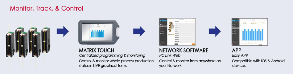 2. PRODUCTION MONITORING - For all our sensors, PC Link Web provides LIVE production tracking which can connect to our Network software, giving you automation at multiple levels. This cloud based system monitors & tracks all yarn stops, breaks, & doffs for showing production/waste in real time. It can also connect to any PC or smartphone to give you instant visibility of your production from anywhere in the world.
